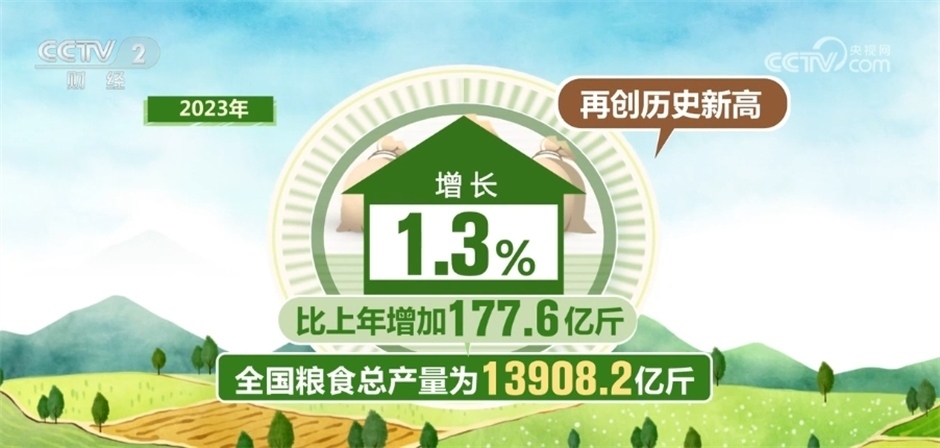 國家統(tǒng)計(jì)局今天(12月11日)發(fā)布的數(shù)據(jù)顯示,2023年,全國糧食總產(chǎn)量為13908.2億斤,比上年增長1.3%,全年糧食產(chǎn)量再創(chuàng)歷史新高。