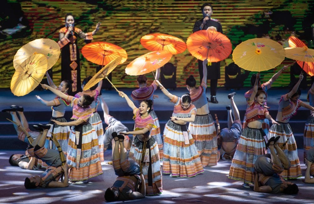 2023年1月18日,以“同心筑厚誼 攜手共發(fā)展”為主題的2023年中越跨國(guó)春節(jié)聯(lián)歡晚會(huì)在中國(guó)云南省紅河哈尼族彝族自治州河口瑤族自治縣舉行,越南老街省民族藝術(shù)歌舞團(tuán)的演員在晚會(huì)上表演歌舞《漂浮在云端的節(jié)日》。