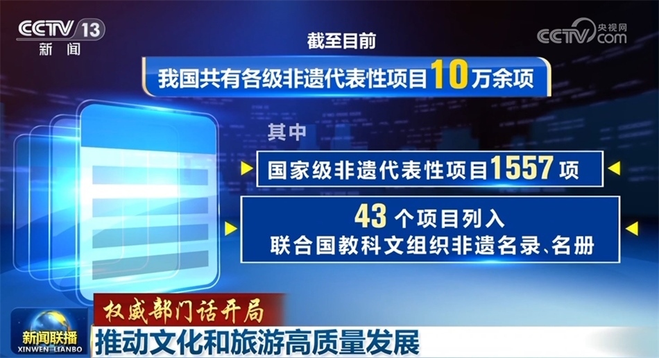 繁榮發(fā)展文化事業(yè)和文化產業(yè),推進城鄉(xiāng)公共文化服務體系提質增效。今年前11個月,文化和旅游部主辦27項展演展示活動,線下觀眾90萬人次,線上觀看量超過18億次,一批彰顯中華審美風范、富有鮮明時代氣息的舞臺藝術作品廣受好評。保護傳承弘揚中華優(yōu)秀傳統(tǒng)文化,中華文明探源工程、考古中國等重大項目得以深入實施,截至目前,我國共有各級非遺代表性項目10萬余項,其中國家級非遺代表性項目1557項,43個項目列入聯(lián)合國教科文組織非遺名錄(名冊),中國世界遺產數(shù)量增至57項。