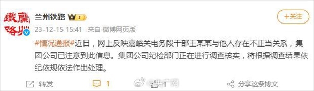 ·網(wǎng)傳國鐵蘭州局干部與女下屬存不正當(dāng)關(guān)系,官方:紀(jì)檢部門正調(diào)查核實。