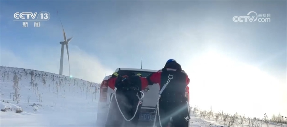 在河北張家口沽源縣,最高氣溫只有零下17攝氏度。華電冀北新能源馳盛風電場的運維員工,冒著寒風檢查線路覆冰情況,發(fā)現(xiàn)并消除線路覆冰101公里。