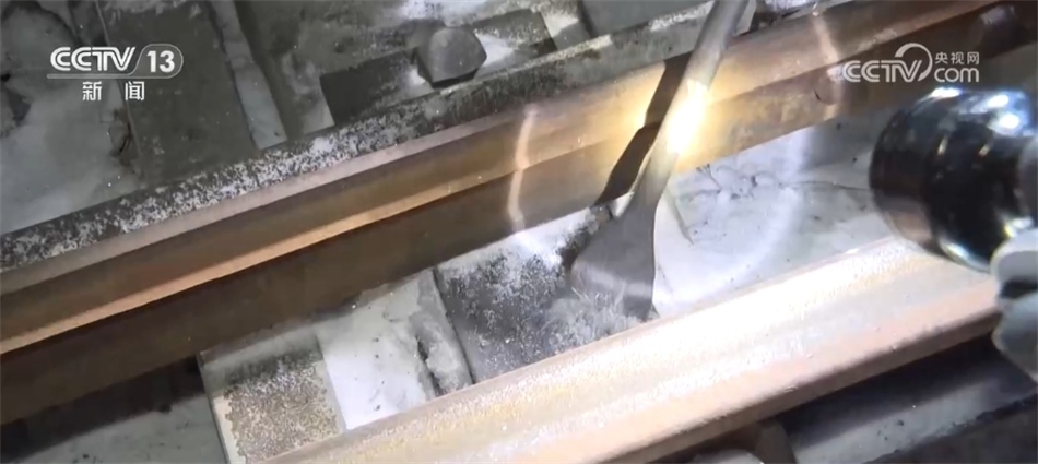 我在車站里看到不僅有給列車編組的司機、調(diào)度員,我還看到在鐵路的道岔還有很多工作人員正在做一些積雪清掃還有除冰的工作。我們可以湊近看一下,可以看到道岔這里現(xiàn)在是被凍住了,已經(jīng)沒法推動這個鐵軌,而這的空間又非常小,所以只能靠這樣的小鏟子一點點鏟,才能把這塊兒的積雪和冰給清干凈。