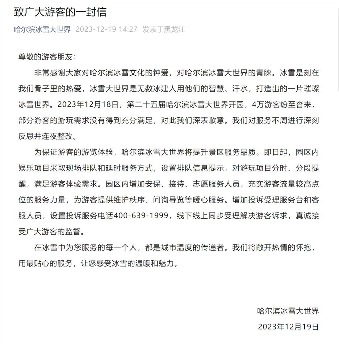 ·哈爾濱冰雪大世界開園首日被喊退票,園區(qū)發(fā)文致歉:連夜整改。當?shù)匚穆镁只貞讶ガF(xiàn)場督導。
