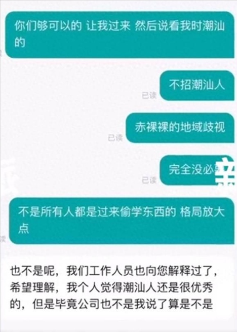 ·廣東深圳一男子求職因籍貫是潮汕直接被拒,工作人員稱“老板說(shuō)潮汕人就會(huì)偷偷摸摸學(xué)東西”。