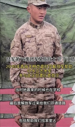 巴丁江措,第76集團(tuán)軍某旅戰(zhàn)士。2010年青海玉樹地震時(shí),解放軍幫他脫險(xiǎn)。如今,同樣成為解放軍的他奮戰(zhàn)在甘肅抗震救災(zāi)一線。他說(shuō):“我想對(duì)以前救我的人說(shuō),我?guī)椭烁嗳耍屗麄優(yōu)槲因湴?!?/p>