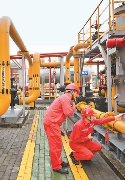 在位于重慶涪陵的中國首個投入商業(yè)開發(fā)頁巖氣田——涪陵頁巖氣田白濤集輸站,技術(shù)人員對設(shè)備進行巡檢。新華社記者 王全超攝