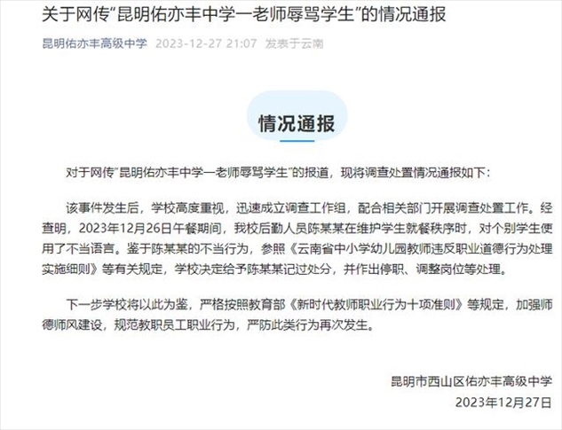 ·昆明某中學(xué)老師辱罵學(xué)生?校方通報(bào):給予記過、停職、調(diào)整崗位等處理。