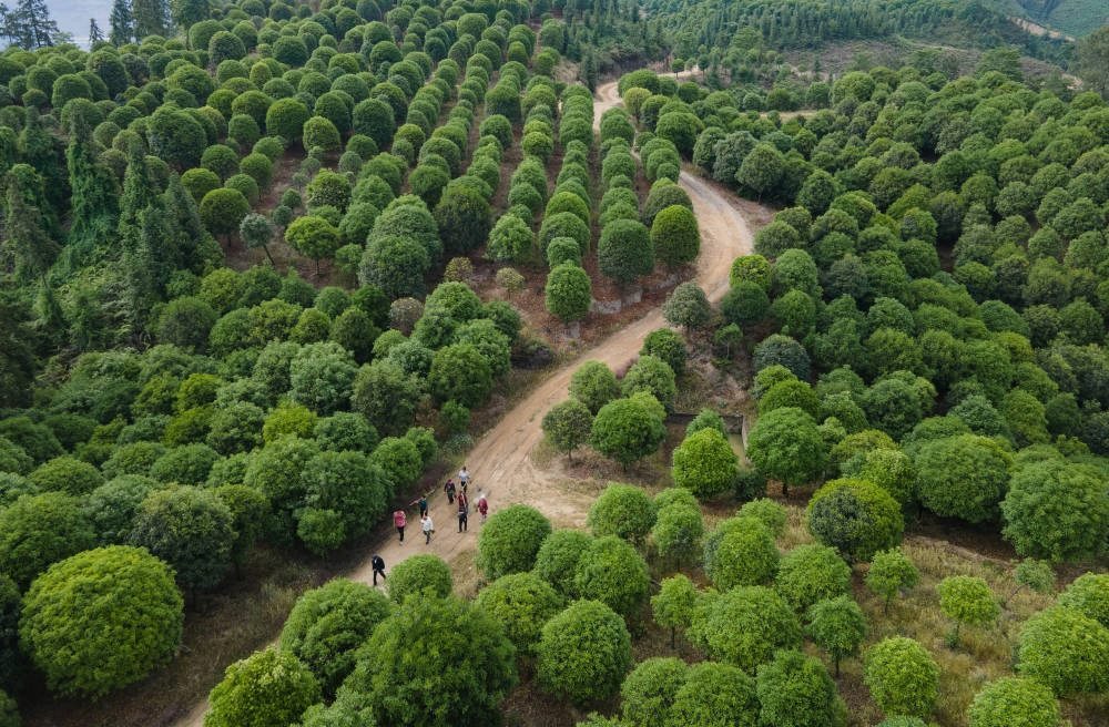5月14日,李秀雄一家和工人走在四川省榮縣東興鎮(zhèn)長興林場(chǎng)(無人機(jī)照片)。25年來,李秀雄一家三代接力植樹造林,讓3000畝荒山變林海。