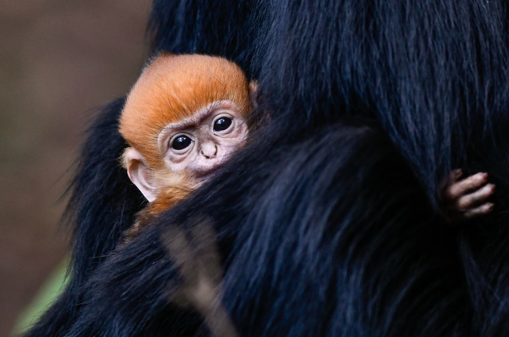 在貴州麻陽河國家級(jí)自然保護(hù)區(qū)拍攝的黑葉猴幼猴(4月30日攝)。新出生的黑葉猴毛色呈金黃色,幾個(gè)月后逐漸變成黑色。