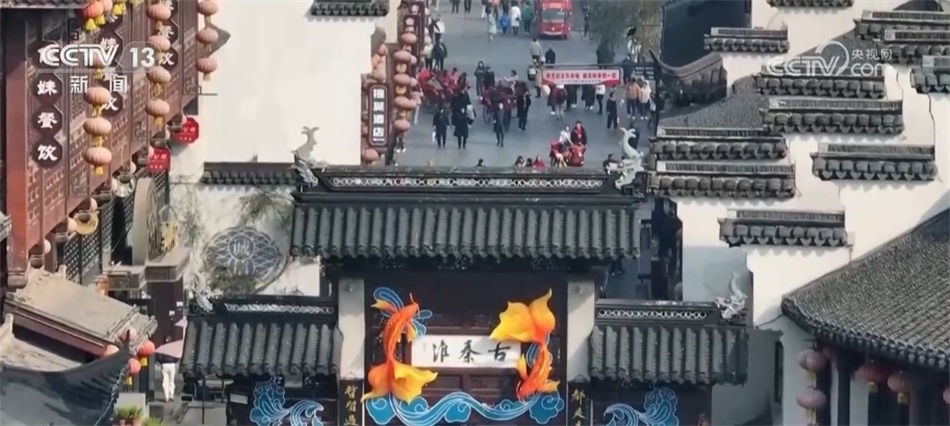 ??????新年將至,南京秦淮河畔的各式花燈陸續(xù)落成,與古建筑相互映襯。碧水繞城,畫舫穿行,裝扮后的古城如畫如詩。在“古秦淮”的牌坊上,魚躍龍門的造型立體生動(dòng)。人們穿過牌坊,采買年貨,拍照留念。在夫子廟南側(cè)的門東歷史文化街區(qū),一條大龍?jiān)煨偷幕粢莱菈ΧⅰJ艚M活靈活現(xiàn),讓古樸的街巷增添了迎新的色彩。
