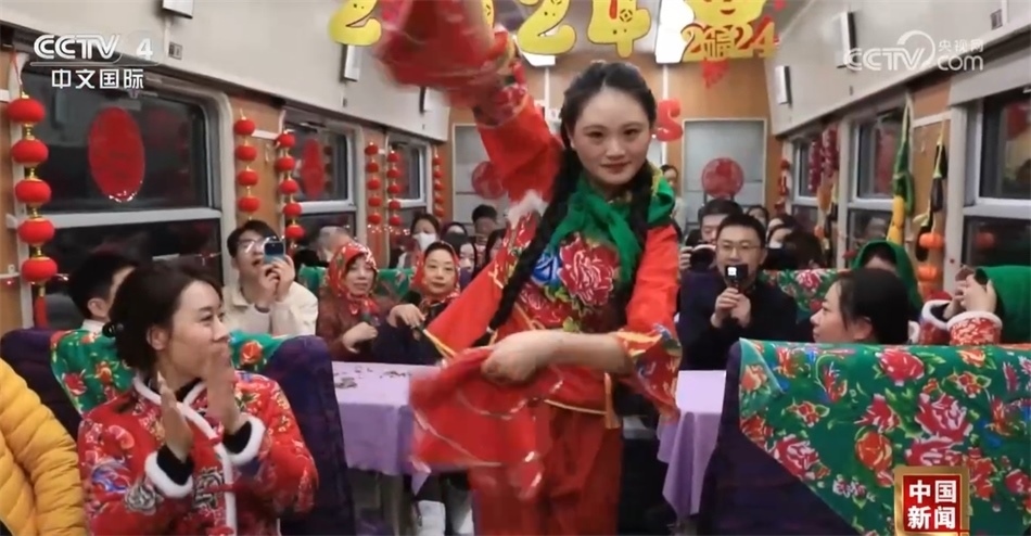 總臺(tái)央視記者 楊曜語(yǔ):我即將登上的列車就是從哈爾濱開往漠河的國(guó)內(nèi)首個(gè)沉浸式東北民俗文化體驗(yàn)列車,坐過的人都說一上車就想盤腿兒了,我們趕緊來體驗(yàn)一下!一上車我就被濃濃的東北文化所感染到了,整個(gè)車廂都被東北大花的經(jīng)典配色裝飾著,再加上隨手就能品嘗到東北特色美食,坐在床鋪上就感覺一秒鐘“穿越”到農(nóng)家炕頭。