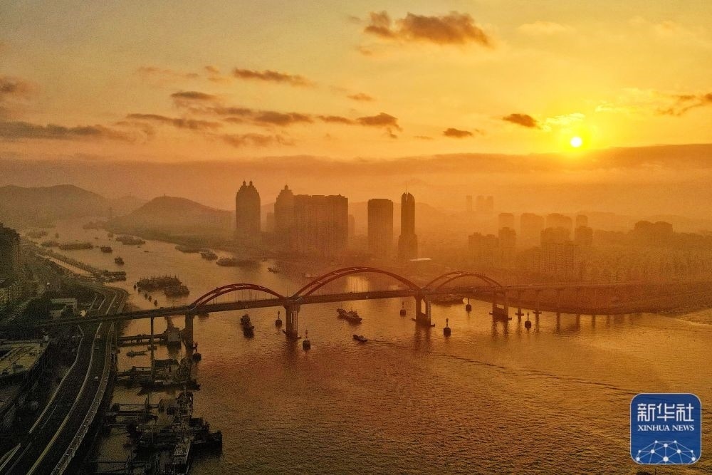 2024年第一縷晨光下的浙江舟山沈家門漁港(1月1日攝,無(wú)人機(jī)照片)。新華社發(fā)(邢守秒 攝)
