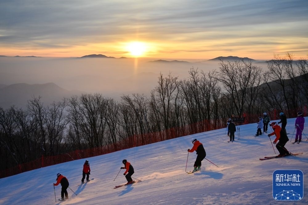 1月1日,在吉林省吉林市萬(wàn)科松花湖度假區(qū),滑雪愛(ài)好者在晨光下滑雪。新華社記者 顏麟蘊(yùn) 攝