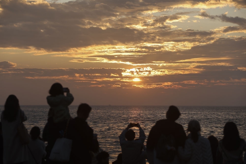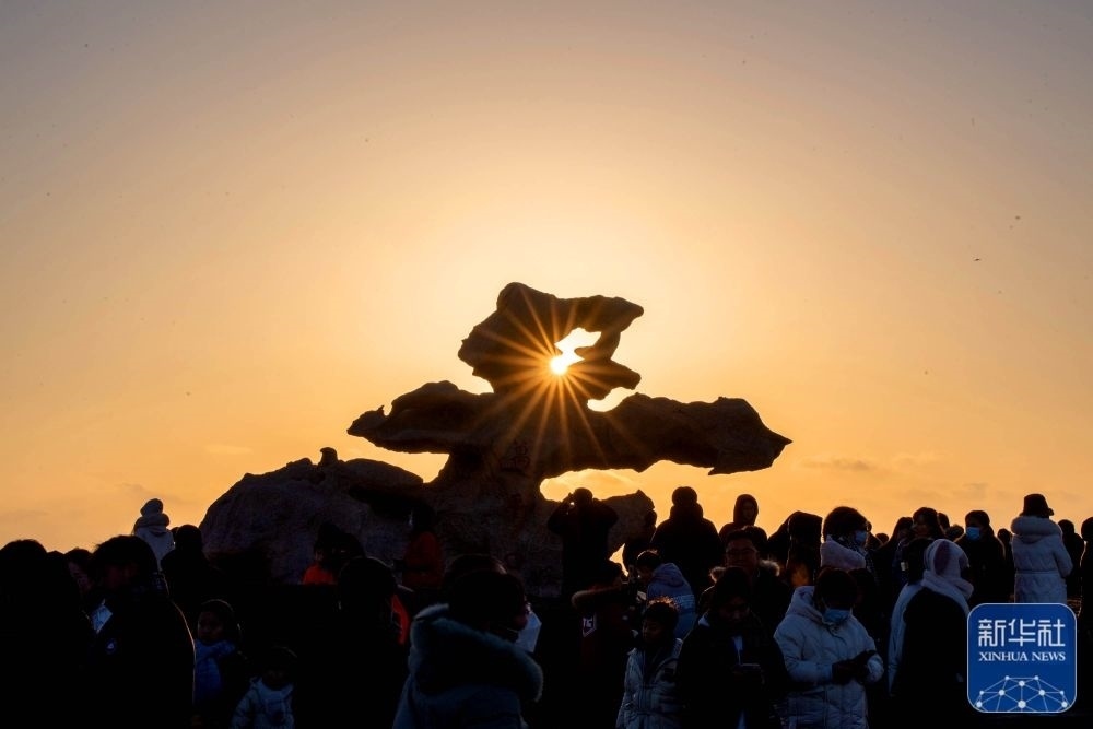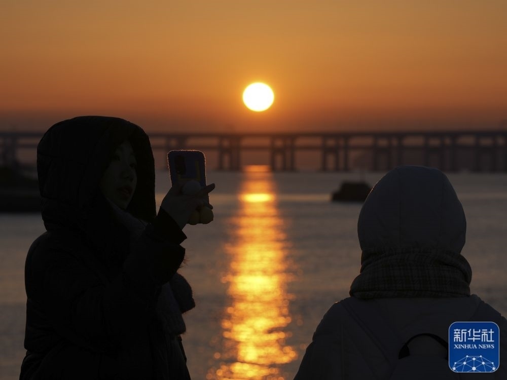 1月1日,人們?cè)谏綎|省煙臺(tái)市萊山區(qū)海濱觀賞新年日出。新華社發(fā)(唐克 攝)