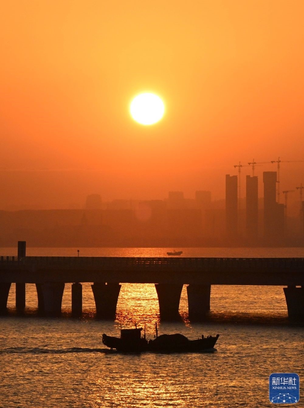 1月1日,一條漁船在新年第一縷晨光中從山東青島膠州灣跨海大橋旁駛過(guò)。新華社記者 李紫恒 攝