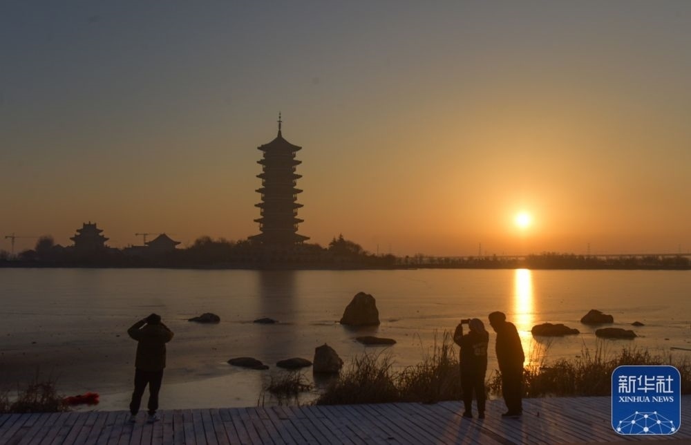 1月1日,人們?cè)谏綎|青島大沽河省級(jí)生態(tài)旅游度假區(qū)迎接新年日出。新華社發(fā)(王昭脈 攝)