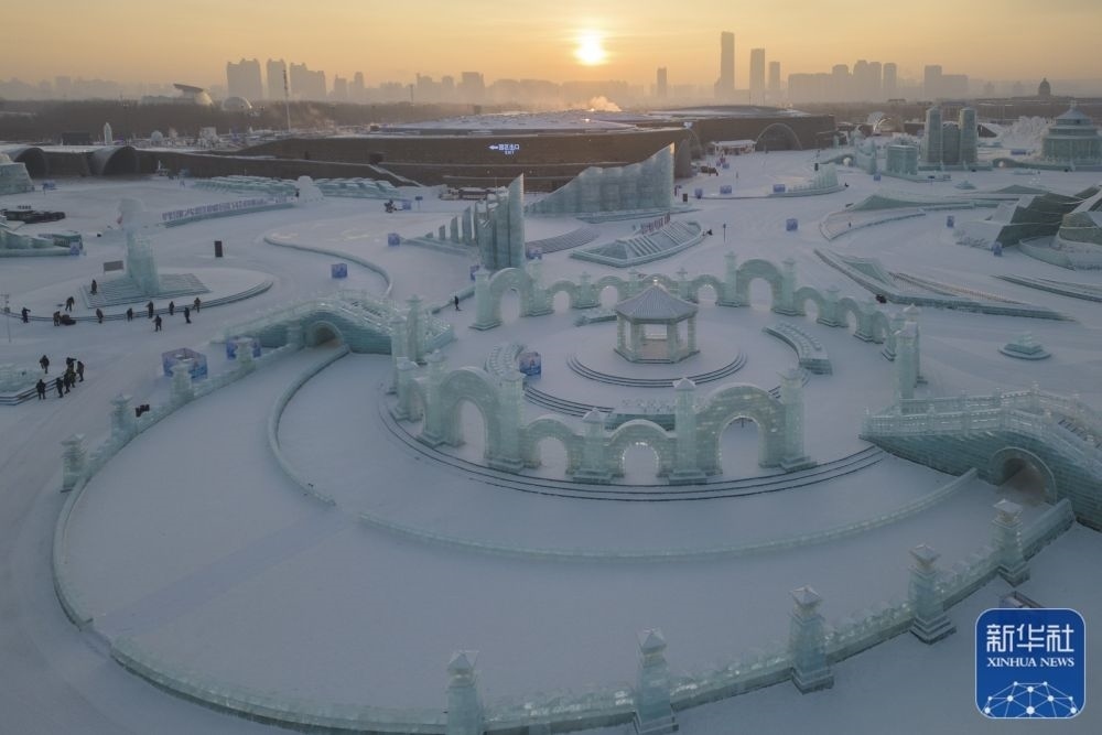 朝陽(yáng)下的哈爾濱冰雪大世界園區(qū)(1月1日攝,無(wú)人機(jī)照片)。新華社記者 張濤 攝
