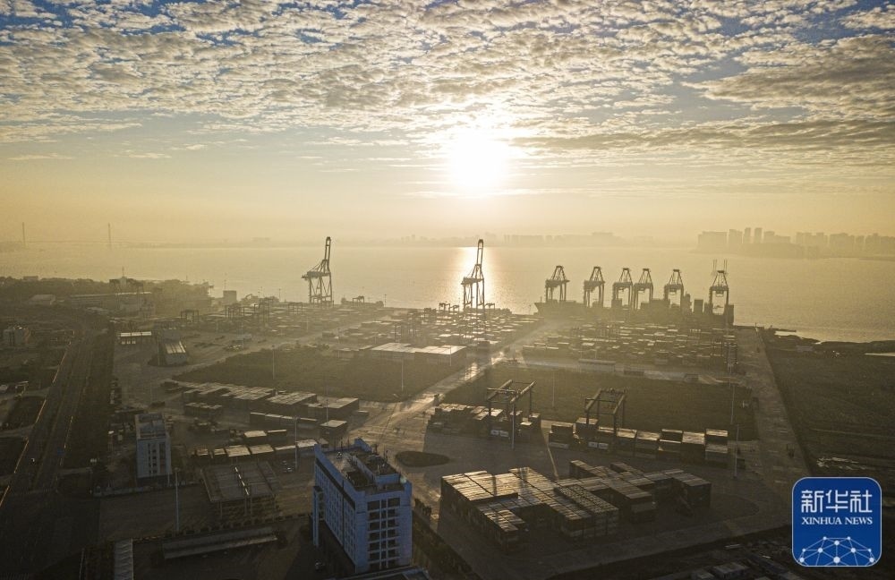 這是1月1日在海南自貿(mào)港重點(diǎn)園區(qū)——洋浦經(jīng)濟(jì)開(kāi)發(fā)區(qū)拍攝的晨光(無(wú)人機(jī)照片)。新華社記者 蒲曉旭 攝