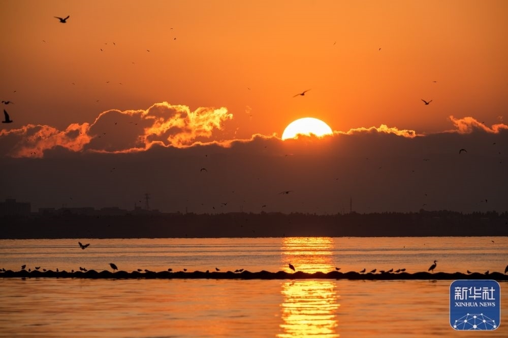 1月1日,在位于江蘇鹽城的中國(guó)黃(渤)海候鳥(niǎo)棲息地(第一期)核心區(qū)域東臺(tái)條子泥海濱,鳥(niǎo)兒迎著朝霞飛翔(1月1日攝,無(wú)人機(jī)照片)。新華社發(fā) (孫家錄 攝)