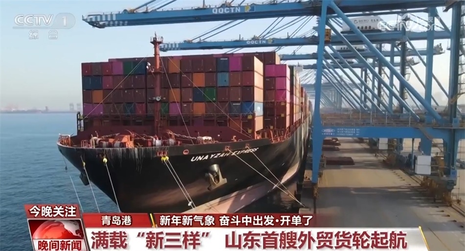 新年伊始,山東首艘外貿(mào)貨輪從青島港起航。3500多個(gè)標(biāo)箱里滿載包括電動(dòng)載人汽車、鋰離子蓄電池、太陽能電池等外貿(mào)“新三樣”,總貨值約2億人民幣。