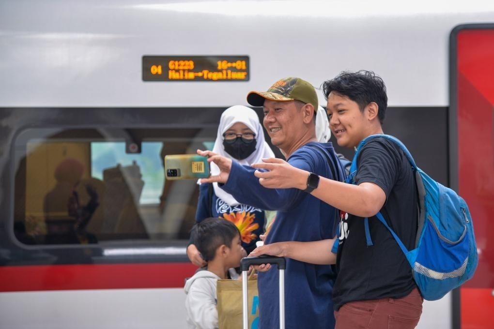 2023年12月25日,乘客在印度尼西亞雅加達(dá)的哈利姆車(chē)站站臺(tái)與雅萬(wàn)高鐵高速動(dòng)車(chē)組合影。截至12月24日,作為中印尼共建“一帶一路”合作的“金字招牌”,雅萬(wàn)高鐵累計(jì)發(fā)送旅客突破100萬(wàn)人次。