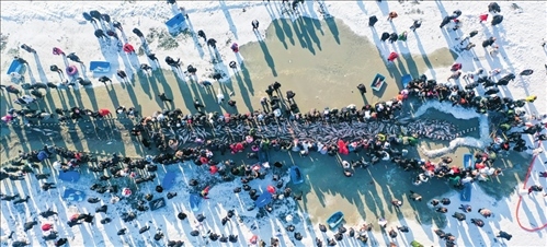 查干湖冬捕,源自北方少數(shù)民族的原始漁獵活動。作為國家級非物質(zhì)文化遺產(chǎn),祭湖、醒網(wǎng)、鑿冰、撒網(wǎng)、魚躍冰封等環(huán)節(jié)在當?shù)乇A糁两瘛T诂F(xiàn)場,游客仿佛看到1000多年前的捕魚場景——冰镩打眼、扭矛走鉤、冰下行網(wǎng)、馬拉絞盤,數(shù)萬條大魚從冰中躍起,漁民們一年的辛苦勞作化作收獲的喜悅。