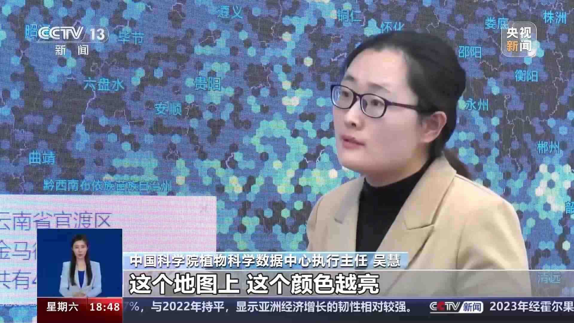 中國科學院植物科學數(shù)據(jù)中心執(zhí)行主任 吳慧:這個地圖上,這個顏色越亮,代表這個區(qū)域分布的我們的重點野生植物越多。