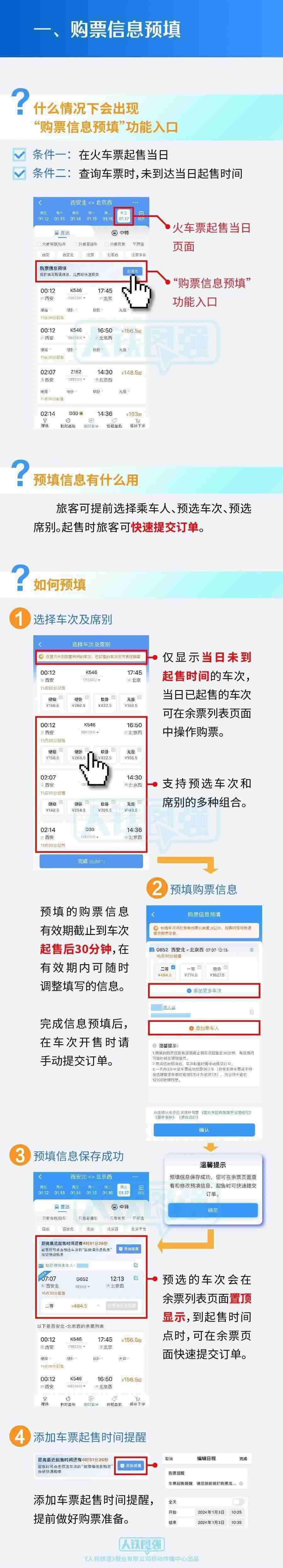 旅客朋友可于車票起售當(dāng)日,預(yù)先填寫乘車人、車次、席別等信息,在車票開始發(fā)售時一鍵提交訂單并完成支付,使旅客購票更便捷。