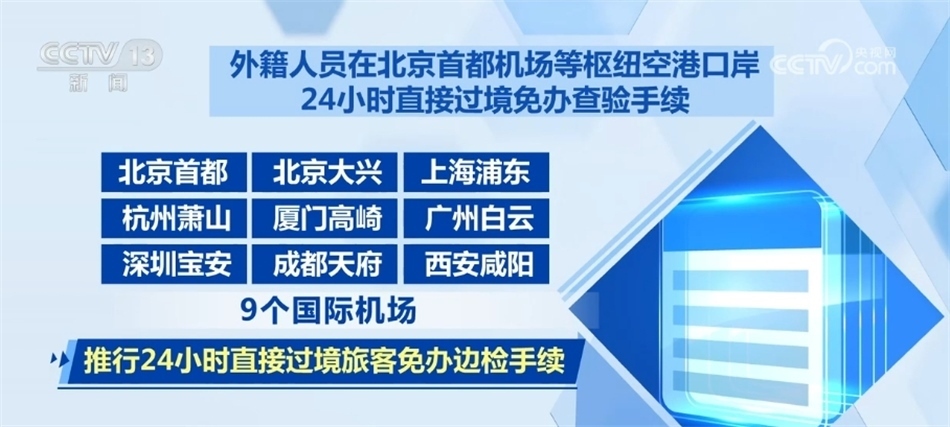 外籍人員在北京首都機(jī)場等樞紐空港口岸24小時(shí)直接過境免辦查驗(yàn)手續(xù)。在北京首都、北京大興、上海浦東、杭州蕭山、廈門高崎、廣州白云、深圳寶安、成都天府、西安咸陽9個(gè)國際機(jī)場,推行24小時(shí)直接過境旅客免辦邊檢手續(xù)。對(duì)于持24小時(shí)內(nèi)國際聯(lián)程機(jī)票,經(jīng)上述任一機(jī)場過境前往第三國或地區(qū)的出入境旅客,可以免辦邊檢手續(xù),直接免簽過境。