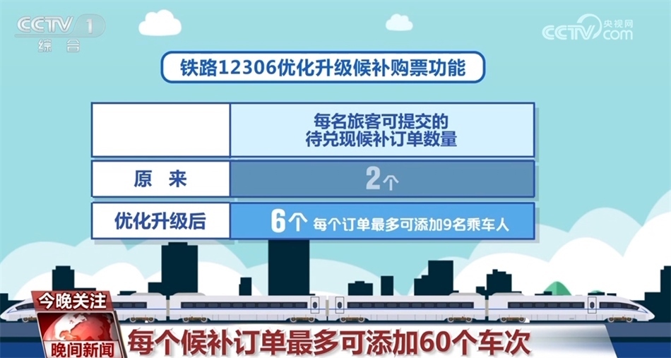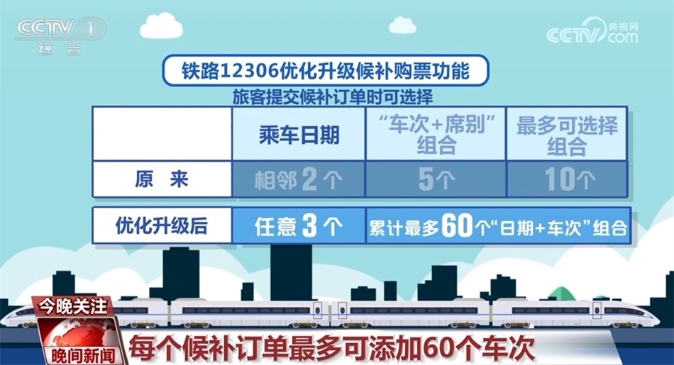 自1月11日零時起,鐵路12306優(yōu)化升級候補(bǔ)購票功能,來看一下具體變化:優(yōu)化升級后,每名旅客可提交的待兌現(xiàn)候補(bǔ)訂單數(shù)量由2個增至6個,每個訂單最多可添加9名乘車人;原來旅客提交候補(bǔ)訂單時,可選擇相鄰2個乘車日期、每個日期可選擇5個“車次+席別”的組合,最多可選擇10個組合。優(yōu)化升級后,旅客可選擇預(yù)售期內(nèi)任意3個乘車日期,累計最多可選擇60個“日期+車次”的組合;原來候補(bǔ)訂單截止兌現(xiàn)時間最晚為開車前2小時,優(yōu)化升級后調(diào)整為開車前20分鐘。