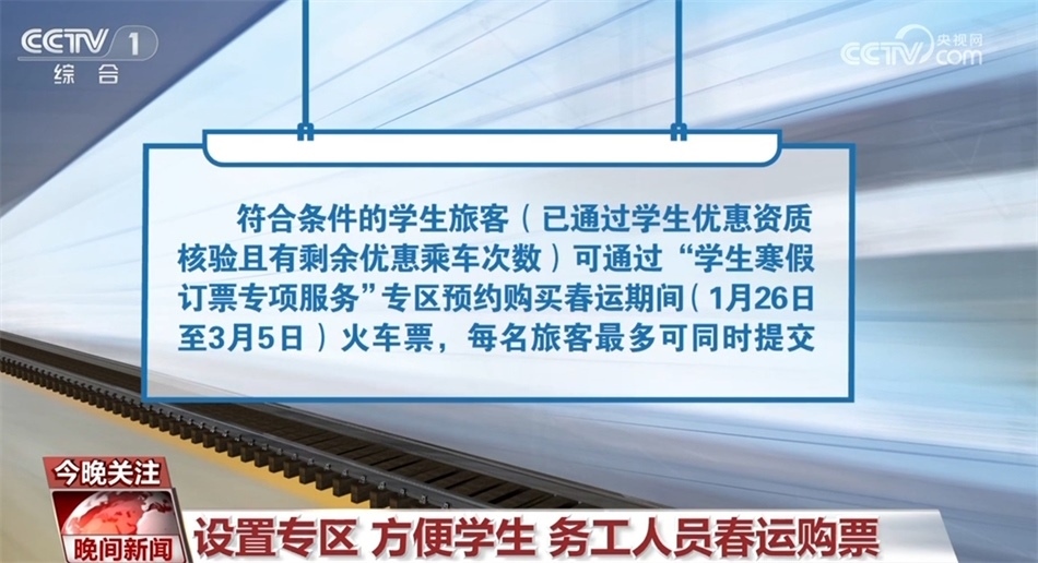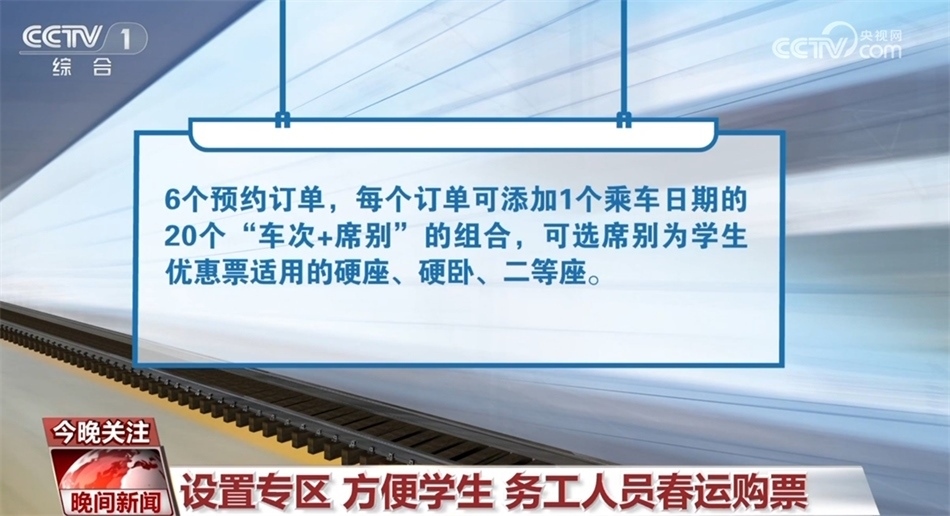 此外,符合條件的學(xué)生旅客(已通過學(xué)生優(yōu)惠資質(zhì)核驗且有剩余優(yōu)惠乘車次數(shù))可通過“學(xué)生寒假訂票專項服務(wù)”專區(qū)預(yù)約購買春運(yùn)期間(1月26日至3月5日)火車票,每名旅客最多可同時提交6個預(yù)約訂單,每個訂單可添加1個乘車日期的20個“車次+席別”的組合,可選席別為學(xué)生優(yōu)惠票適用的硬座、硬臥、二等座。