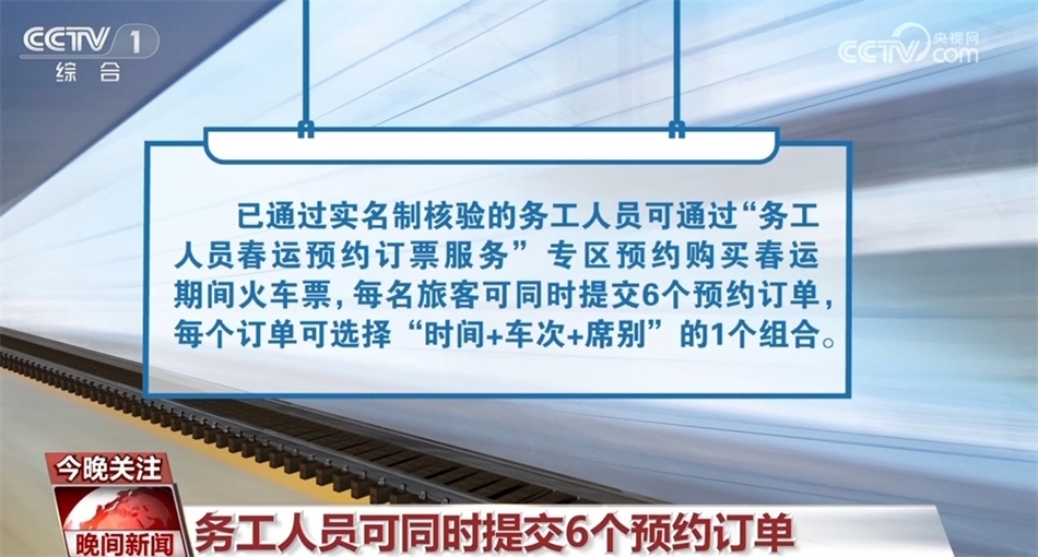 已通過實名制核驗的務(wù)工人員可通過“務(wù)工人員春運(yùn)預(yù)約訂票服務(wù)”專區(qū)預(yù)約購買春運(yùn)期間火車票,每名旅客可同時提交6個預(yù)約訂單,每個訂單可選擇“時間+車次+席別”的1個組合。
