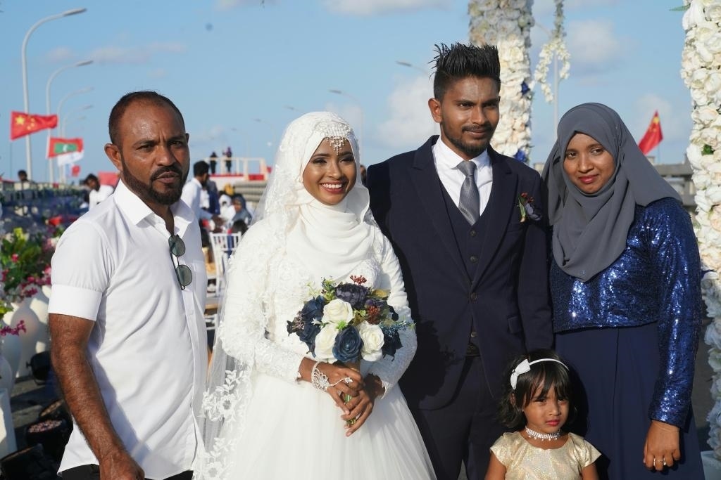 2018年8月31日,在剛剛正式通車(chē)的中馬友誼大橋上,一對(duì)馬爾代夫新婚夫婦與家人合影。