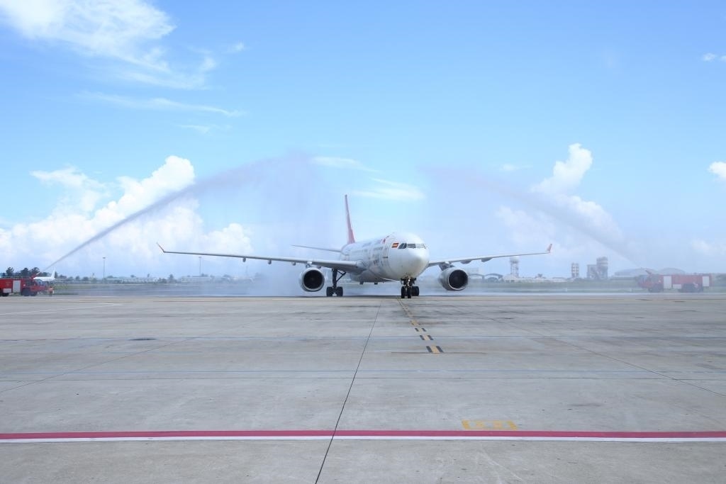 2023年1月18日,中國(guó)首都航空J(rèn)D455航班在馬爾代夫馬累維拉納國(guó)際機(jī)場(chǎng)接受水門(mén)禮。