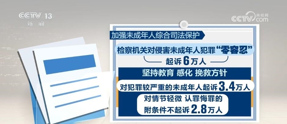 加強(qiáng)未成年人綜合司法保護(hù)。檢察機(jī)關(guān)對侵害未成年人犯罪“零容忍”,起訴6萬人。堅(jiān)持教育、感化、挽救方針,對犯罪較嚴(yán)重的未成年人起訴3.4萬人;對情節(jié)輕微、認(rèn)罪悔罪的,附條件不起訴2.8萬人。部署加強(qiáng)犯罪預(yù)防工作,推動(dòng)罪錯(cuò)未成年人分級干預(yù),協(xié)調(diào)推動(dòng)專門學(xué)校建設(shè),依法矯治有嚴(yán)重不良行為的未成年人。