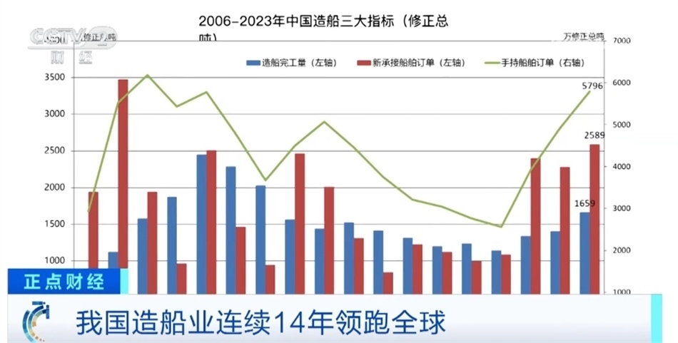 總臺(tái)央視記者 吳天白:在2023年中國(guó)造船業(yè)統(tǒng)計(jì)數(shù)據(jù)中,我們還可以看到三大指標(biāo)占國(guó)際市場(chǎng)份額分別是50.2%、66.6%和55.0%,首次全部超過50%。從這幾張數(shù)據(jù)圖中,我們可以看出,我國(guó)高技術(shù)、高價(jià)值船型的新接訂單量創(chuàng)2008年以來(lái)新高,在這里我們可以看到中國(guó)新接綠色動(dòng)力船舶訂單占國(guó)際市場(chǎng)的份額也是連年增長(zhǎng),2023年全年已經(jīng)達(dá)到了57%。這也表明了未來(lái)全球一半以上的新能源船都將產(chǎn)自中國(guó)。