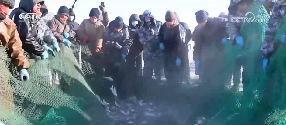 在克什克騰旗達(dá)里湖現(xiàn)場,人工鑿冰、冰下走網(wǎng),冬捕隊(duì)員在作業(yè)時(shí)選用5公分網(wǎng)眼,這樣捕魚時(shí)就能漏掉小魚。馬拉絞盤將大網(wǎng)拖拽出網(wǎng)口,滿載魚兒的漁網(wǎng)慢慢地從湖水中出來,游客們感受豐收的喜悅。