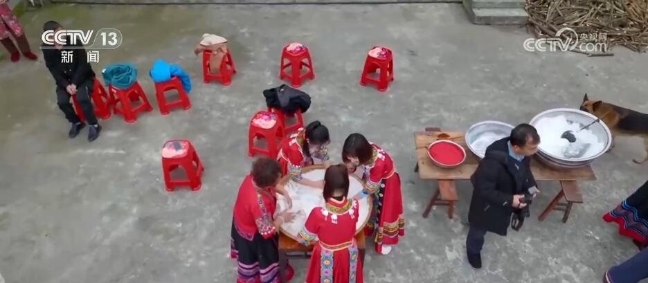 隨著春節(jié)的臨近,年味漸漸濃了起來(lái)。在江口縣凈河村村民李洪江家中,傳來(lái)陣陣舂碓聲。李洪江一家和鄰居們齊聚一堂,做起了“紅粑粑”,大家忙得不亦樂(lè)乎。
