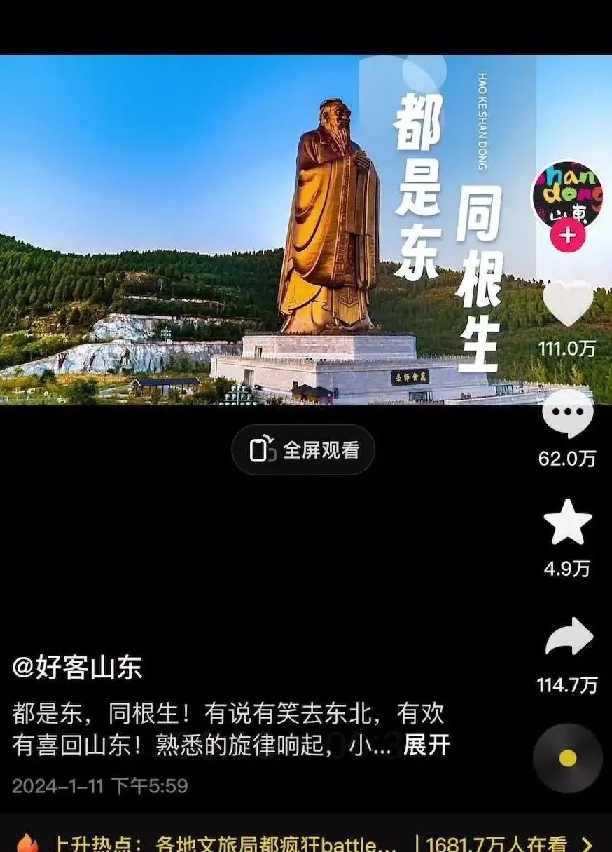 有說有笑去東北,有歡有喜回山東……”山東文旅呢,用一條“我姓東”的土味視頻把自己送上了熱搜,目前超111萬網(wǎng)友點(diǎn)贊。