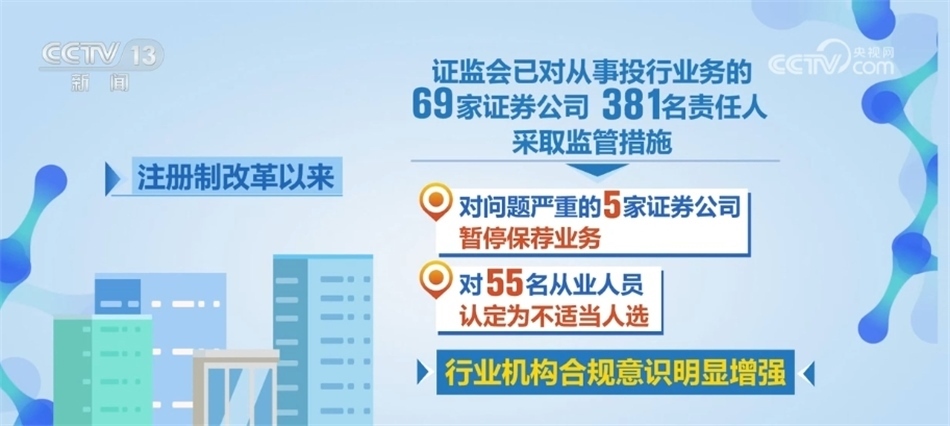 數(shù)據(jù)顯示,注冊制改革以來,證監(jiān)會已對從事投行業(yè)務(wù)的69家證券公司、381名責(zé)任人采取了監(jiān)管措施,特別是對問題嚴(yán)重的5家證券公司暫停保薦業(yè)務(wù),對55名從業(yè)人員認(rèn)定為不適當(dāng)人選,行業(yè)機(jī)構(gòu)合規(guī)意識明顯增強(qiáng)。