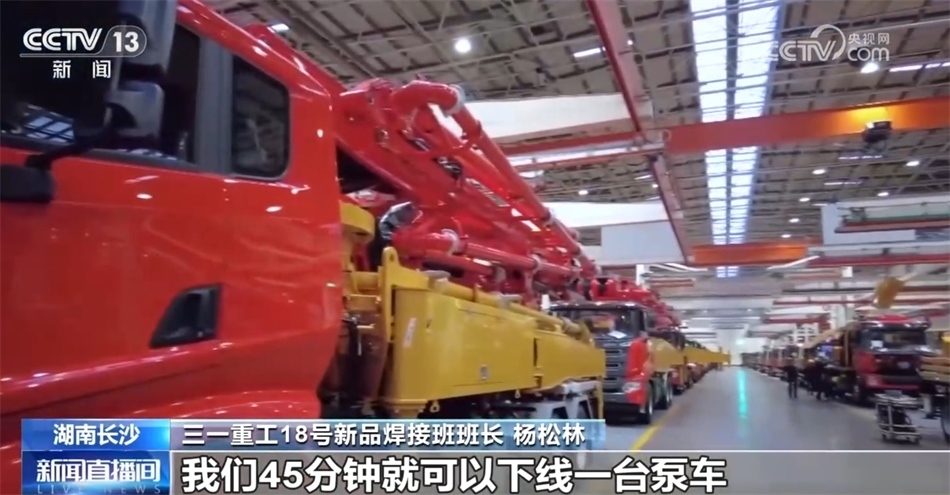 三一重工18號新品焊接班班長 楊松林:大家好,我是新品焊接班班長楊松林。我們工廠主要是生產泵車,看,就是我身后的這個大家伙。我們45分鐘就可以下線一臺泵車。