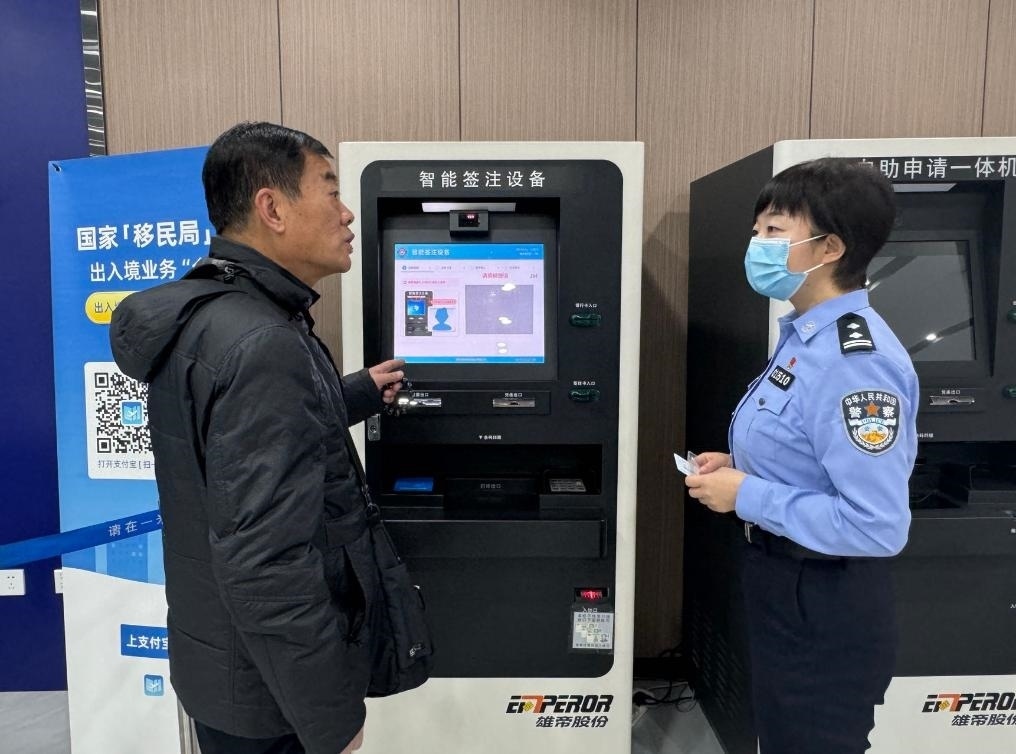 1月11日,在甘肅省蘭州市公安局出入境接待大廳,工作人員引導(dǎo)前來辦理出入境證件的市民使用智能簽注機。新華社記者 任延昕 攝