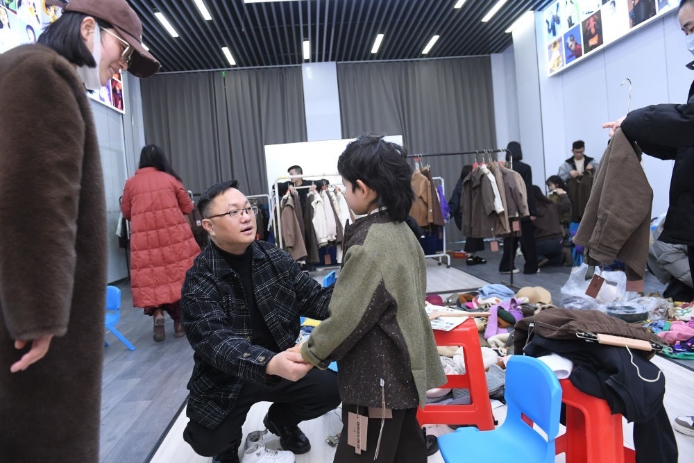 2024年1月17日,在位于浙江省湖州市織里鎮(zhèn)的萬(wàn)順?lè)椆煞萦邢薰荆ぷ魅藛T(前左二)在品牌的2024秋季新品審版會(huì)后臺(tái)和小模特交流。織里鎮(zhèn)是中國(guó)最大的童裝產(chǎn)業(yè)集群地,聚集著1.4萬(wàn)家童裝企業(yè)。新華社記者 翁忻旸 攝