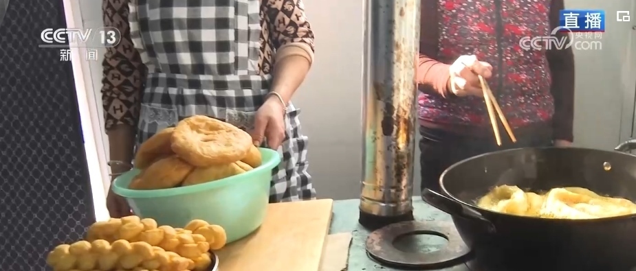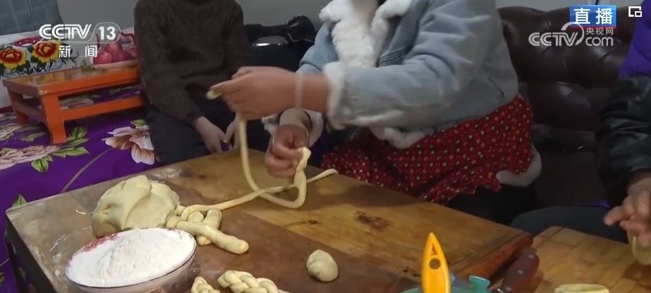 炸年饃是當(dāng)?shù)赝磷迦罕娪哟汗?jié)的傳統(tǒng)習(xí)俗。一家人齊上陣,這邊兩位大姐正在將發(fā)好的面揉好、揪出面劑子、搟成圓形、表面抹上清油,放進(jìn)油鍋里炸熟。對(duì)于土族群眾來說,進(jìn)入臘月之后就開始做年饃、宰年豬、置辦年貨,年味兒就濃了。炸年饃是當(dāng)?shù)厝罕娖碓感碌囊荒觑L(fēng)調(diào)雨順、五谷豐登、平安順?biāo)斓拿篮迷⒁狻V谱髂牮x的面粉、菜籽油等材料都是政府給受災(zāi)群眾提供的物資。
