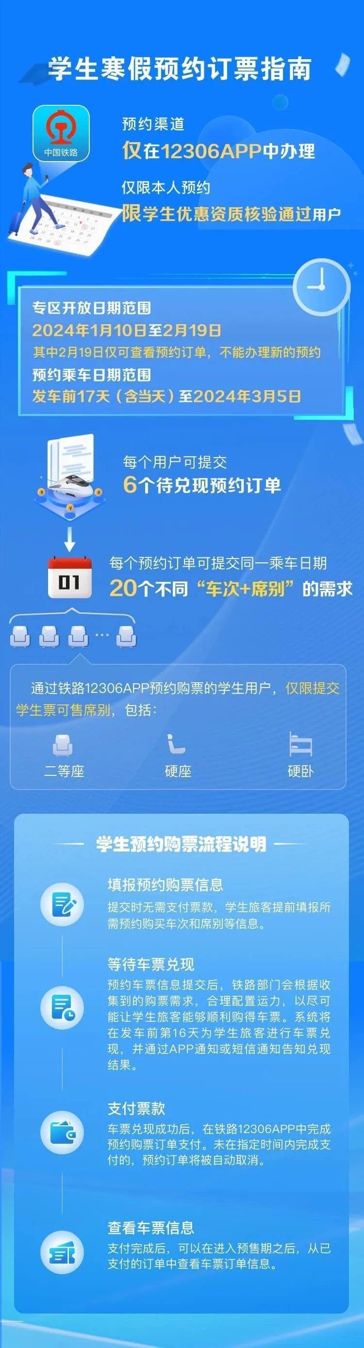 學生、務工人員通過鐵路12306專區(qū)購買春運期間火車票,可提交開車前17天(含)以上的出行購票需求,最晚可預約3月5日的車票。符合條件的旅客朋友可在開車前17天23時前在12306手機客戶端提交購票需求,在開車前16天查詢兌現結果,須在開車前第16天23時前,通過12306手機客戶端預約專區(qū)支付票款,逾期未支付的,訂單自動取消;兌現成功后逾期未支付達到5次的,不再提供預約購票服務。