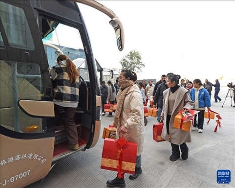 1月28日,在浙江省臺州市仙居縣,一家企業(yè)的甘肅籍員工登上返鄉(xiāng)過年專車。新華社發(fā)(王華斌 攝)
