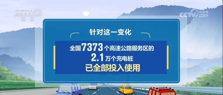 今年公路出行還有一個(gè)新變化,就是在小客車出行當(dāng)中,新能源車輛占比增多。針對這一變化,目前,全國7373個(gè)高速公路服務(wù)區(qū)的2.1萬個(gè)充電樁已全部投入使用。
