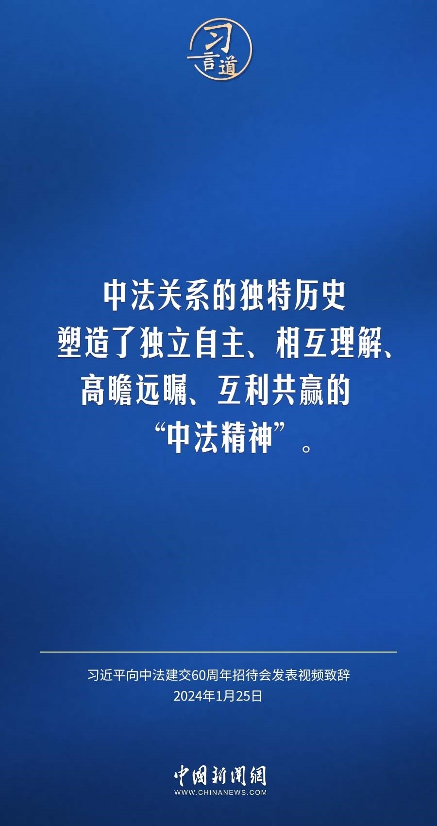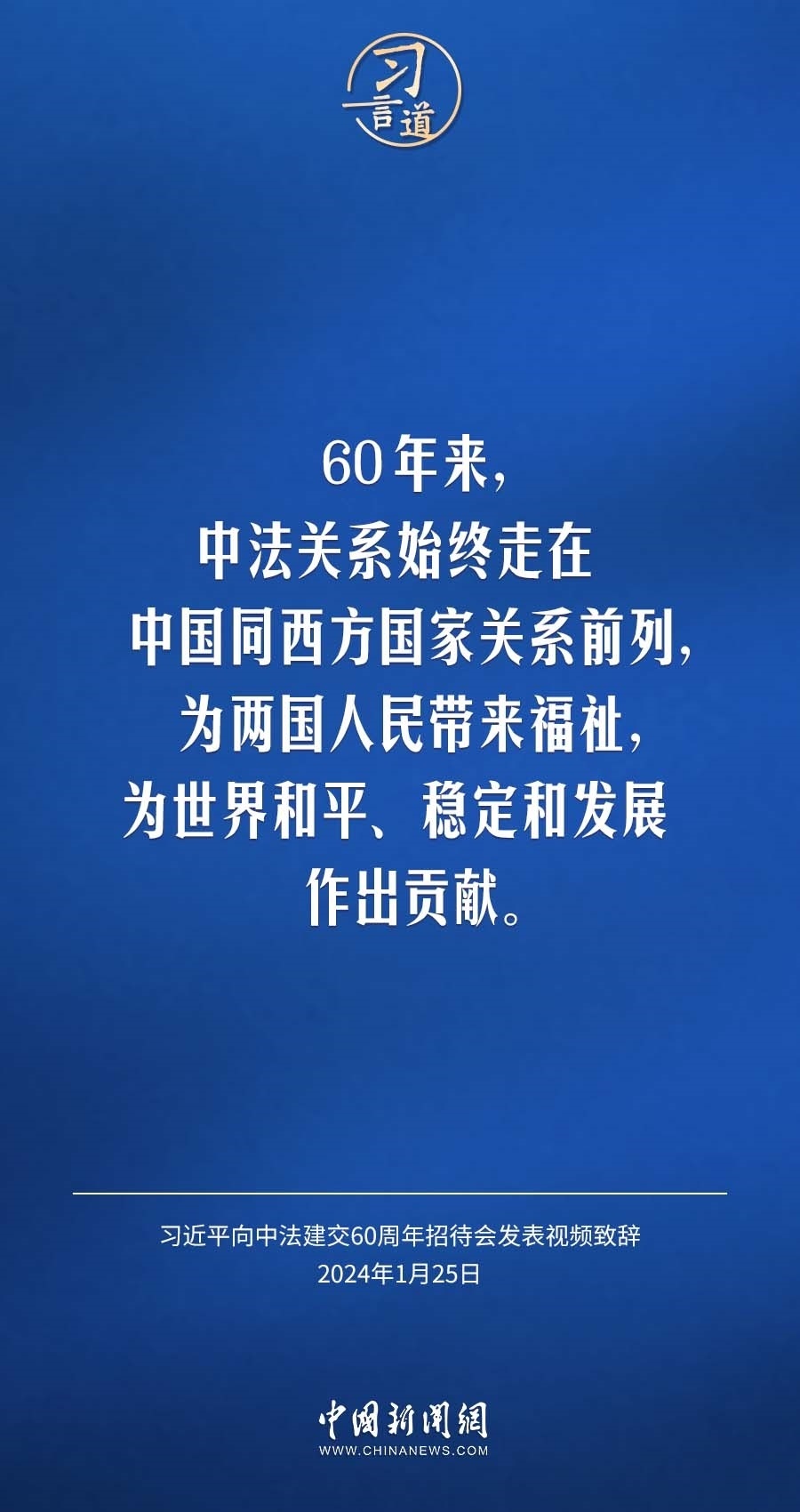 1月25日,中法建交60周年招待會(huì)在國(guó)家大劇院舉行,國(guó)家主席習(xí)近平發(fā)表視頻致辭。習(xí)近平指出——