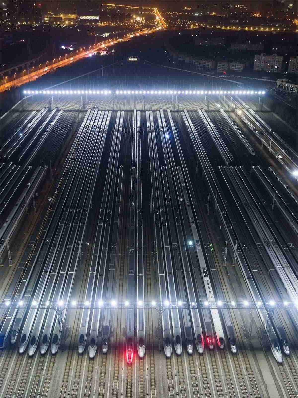 1月26日凌晨1時(shí)許,春運(yùn)前夜,在武漢動(dòng)車段的存車線上,一列列完成檢修的動(dòng)車組集結(jié)完畢,猶如“陸地航母”一般,蓄勢待發(fā),迎接春運(yùn)。(湖北日報(bào)全媒記者 任勇 通訊員 許輝 劉博洋 攝)