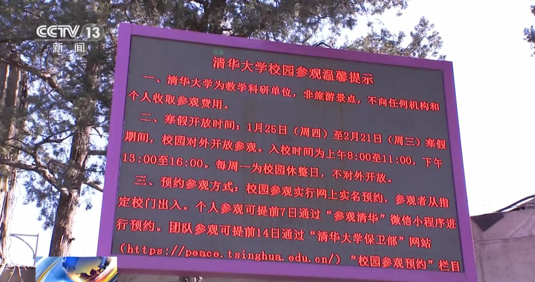 清華大學(xué)保衛(wèi)部 張運騰:因為寒假的時候,學(xué)校仍然有一些教學(xué)科研的任務(wù)還在進行,到一些教室或者實驗室周邊,希望能夠輕音輕語,文明參觀。我們也在這里也特別倡導(dǎo)大家進入校園以后能夠遵守學(xué)校的管理的一些規(guī)定。